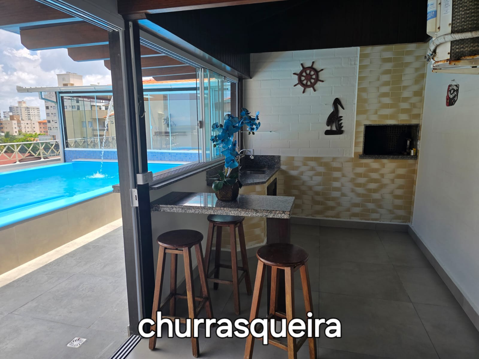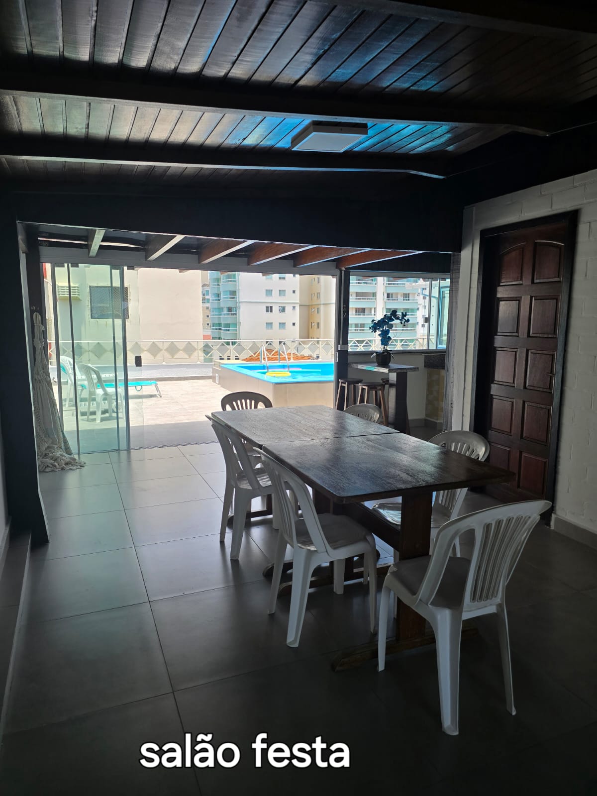 – área de festa com churrasqueira a carvão.
